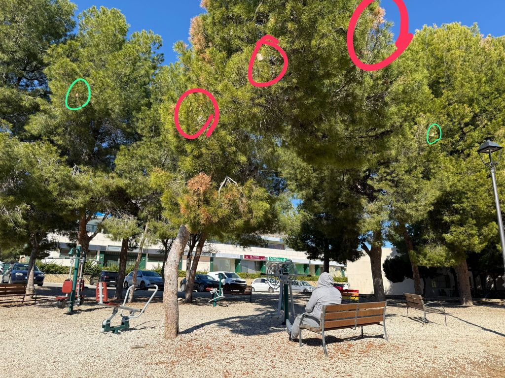 Si bien a final de año el ayuntamiento actuó en algún lugar, como un parque canino, lo cierto es que tal actuación aislada no ha servido para que donde no se ha actuado las orugas hayan empezado a abandonar sus nidos pululando por las aceras, o estar a punto de caer en zonas como un parque de juegos para personas adultas, así como en las proximidades del centro social, frecuentado por cientos de vecinos.