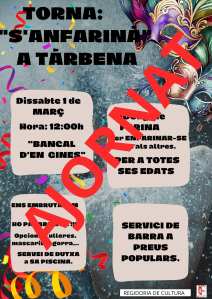 Des de l’Ajuntament de Tàrbena informem que degut a sa previsió de pluja prevista per al dissabte 1 de març, la festa «S’Anfarinà» es suspén i es trasllada al dissabte 19 d’abril (Dissabte Sant) a sa mateixa hora. Continuarem informant.