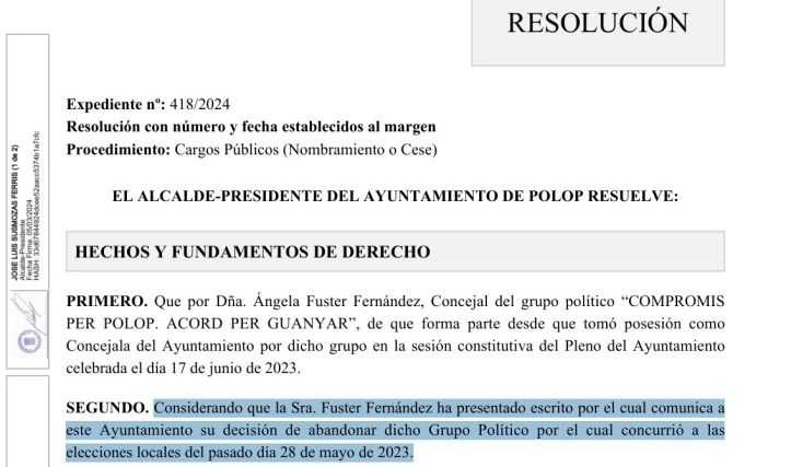 En este caso, la primera tenencia de Alcaldía, en Polop de la Marina, recae en Ángela Fuster, la concejal no adscrita desde que renunció hace un año a seguir representando a «Compromís per Polop. Acord per Guanyar»