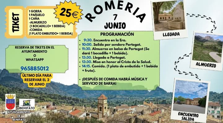 Este sábado 7 de junio se celebrará la tradicional Romería de Benifato, con salida por el sendero de Partegat y almuerzo en la balsa.