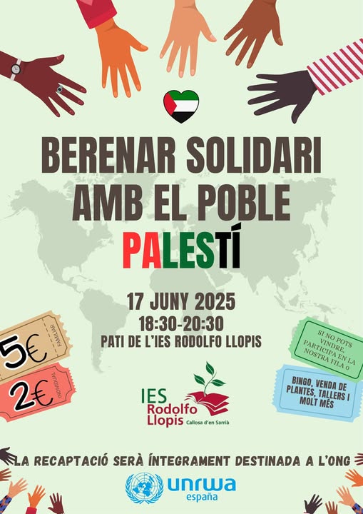 Por otra parte, en Callosa d’en Sarrià, el próximo martes día 17 de junio se realizará en el instituto, desde las 18:30 hasta las 20:30h, una merienda solidaria a favor del pueblo palestino debido a la grave crisis humanitaria que está sufriendo.