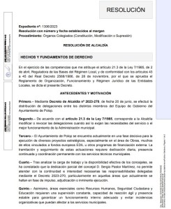 En ese contexto, el texto reconoce expresamente que la dedicación parcial de Sergio Pastor “no permite atender con la continuidad e intensidad necesarias” las responsabilidades que tenía asignadas, lo que ha llevado a retirar sus competencias y redistribuirlas entre otros concejales o asumirlas directamente desde la Alcaldía.